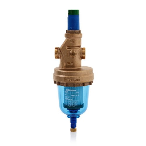 Kombiniertes Druckreduzierventil mit primärseitigem Feinfilter, Gehäuse aus Rotguss, Oberteil aus glasfaserverstärktem Kunststoff, Ventilschieber aus erosionsfestem Chromnickelstahl, beidseitig Manometeranschluss, Filtereinsatz und Klarsicht- Filterbecher mit Gewindering aus Kunststoff, Entleerventil in Filterbecher integriert; mit Standard-Filtereinsatz 100 Mikron aus PES-Gewebe